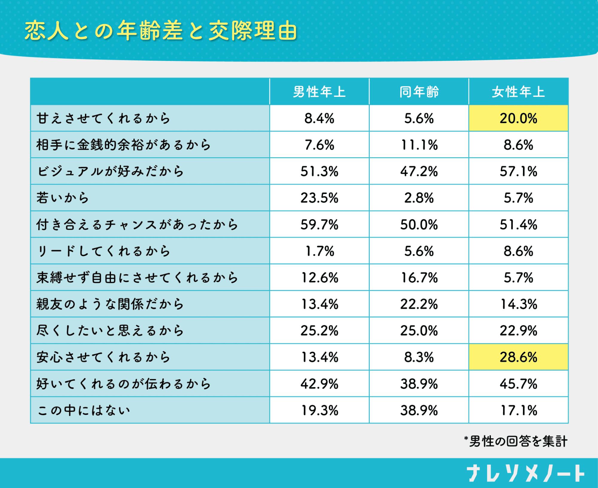 年上女性と付き合う男性は恋人との交際理由に「甘えさせてくれるから」「安心させてくれるから」を選ぶ傾向が強いことがわかります。