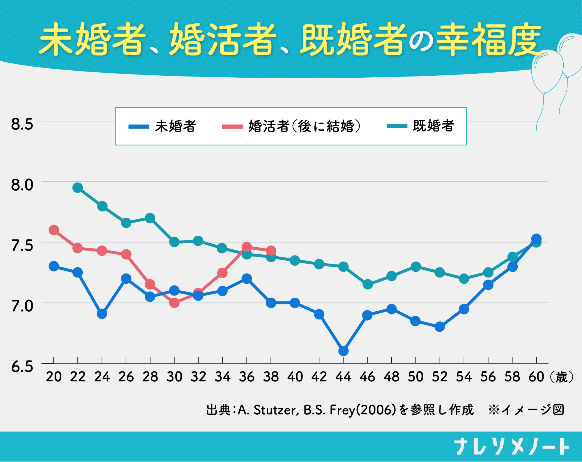 結婚と幸福度の関係を調査した研究・A.Stutzer, B.S. Frey(2004)では、20歳から60歳に至るまで、既婚者のほうがずっと幸福度の水準が高いことが示されています。