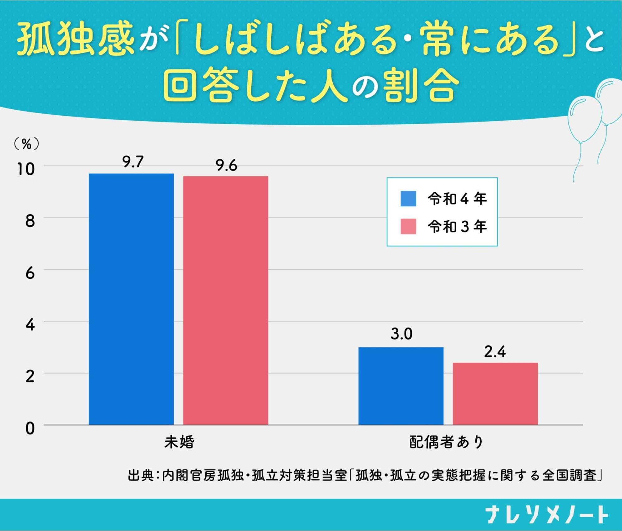 令和4年の内閣官房孤独・孤立対策担当室「孤独・孤立の実態把握に関する全国調査」によれば、独身者(未婚)は既婚者と比べると3倍以上の人が孤独を感じていると回答しています。