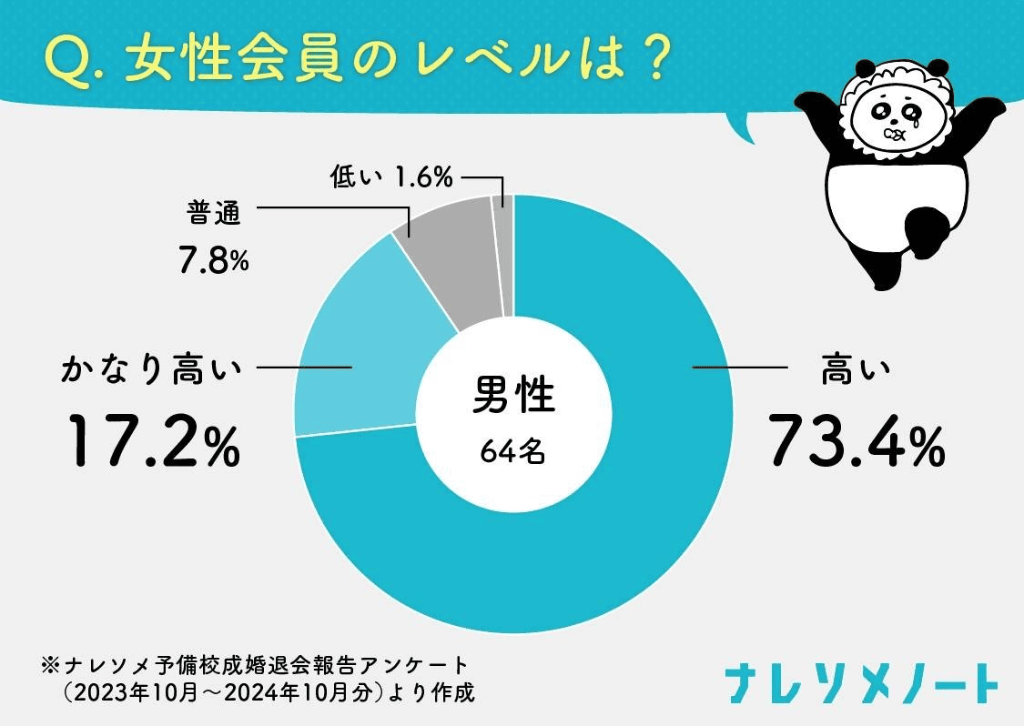 しかも、結婚相談所で「美人と出会えた」と話す男性はとても多く、結婚相談所ナレソメ予備校を利用した64名の男性の実に90.6%が「女性会員のレベルが高い・かなり高い」と回答。つまり、「確実に会える」上に「女性のレベルも高い」のです。