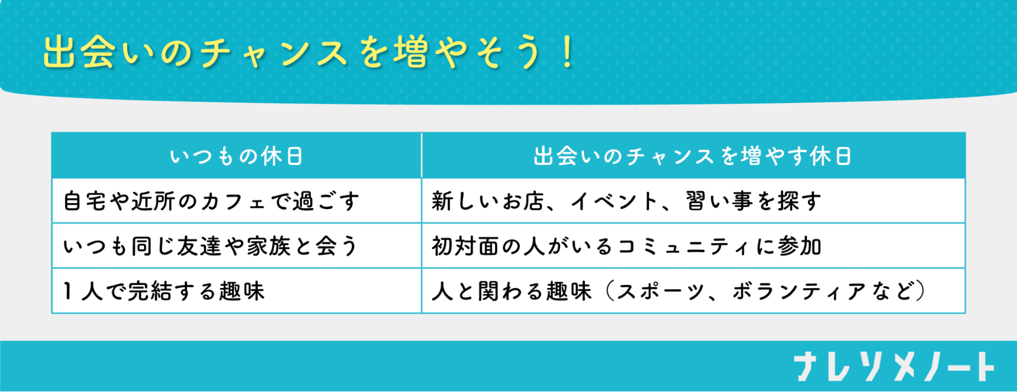 また「出会いがない」とは感じていても、忙しさや気まずさ、面倒くささなどを理由に、人と関わる場を避けてしまってはいませんか? そんな行動が、出会いのチャンスを自分で遠ざけてしまっている可能性もあるのです。