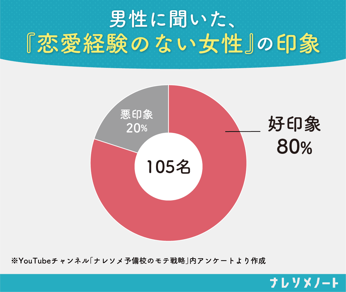 ナレソメ予備校の男性向けYouTubeチャンネル内で実施した、恋愛経験のない女性に対する印象に関するアンケートでは、実に約80%の男性が「好印象」と回答していました。