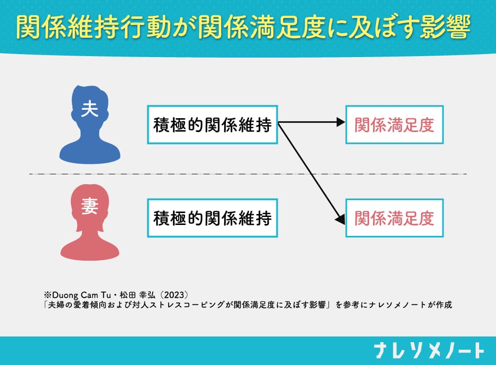 • 夫が「積極的に関係を維持しよう」というスタンスだと、妻の関係満足度は上がる。