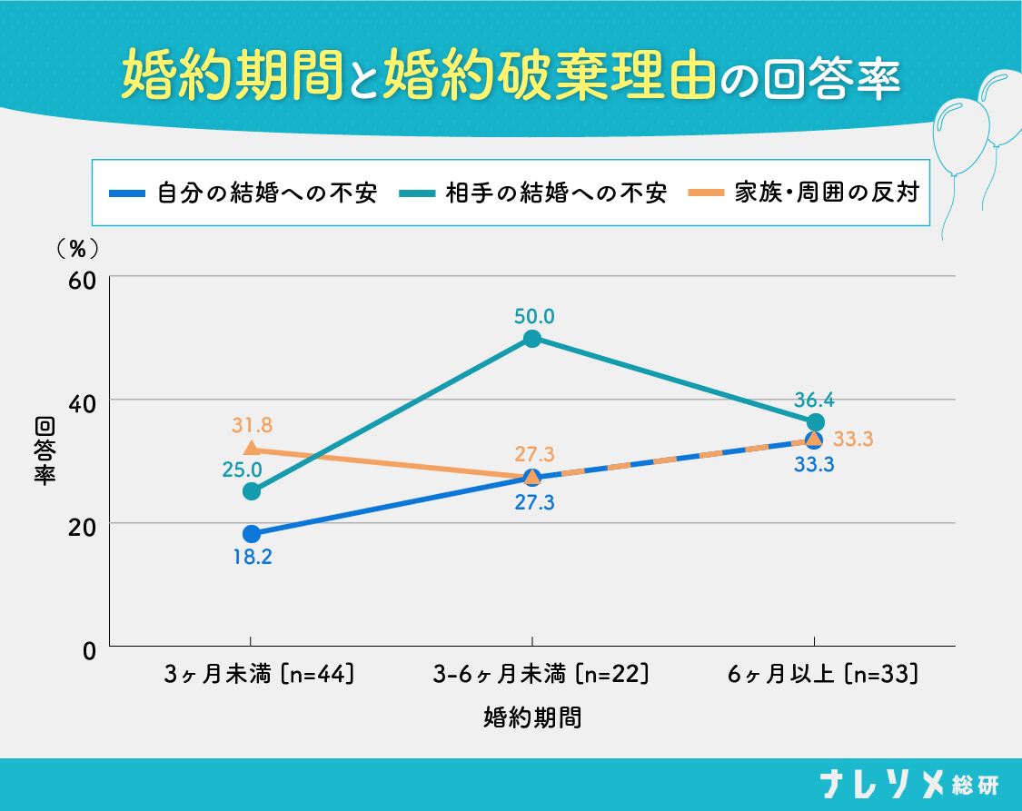 婚約期間が3か月未満で18.2%だったのに対し、3か月以上6か月未満では27.3%、そして6か月以上では33.3%と、期間が長引くにつれて不安が増幅しています。