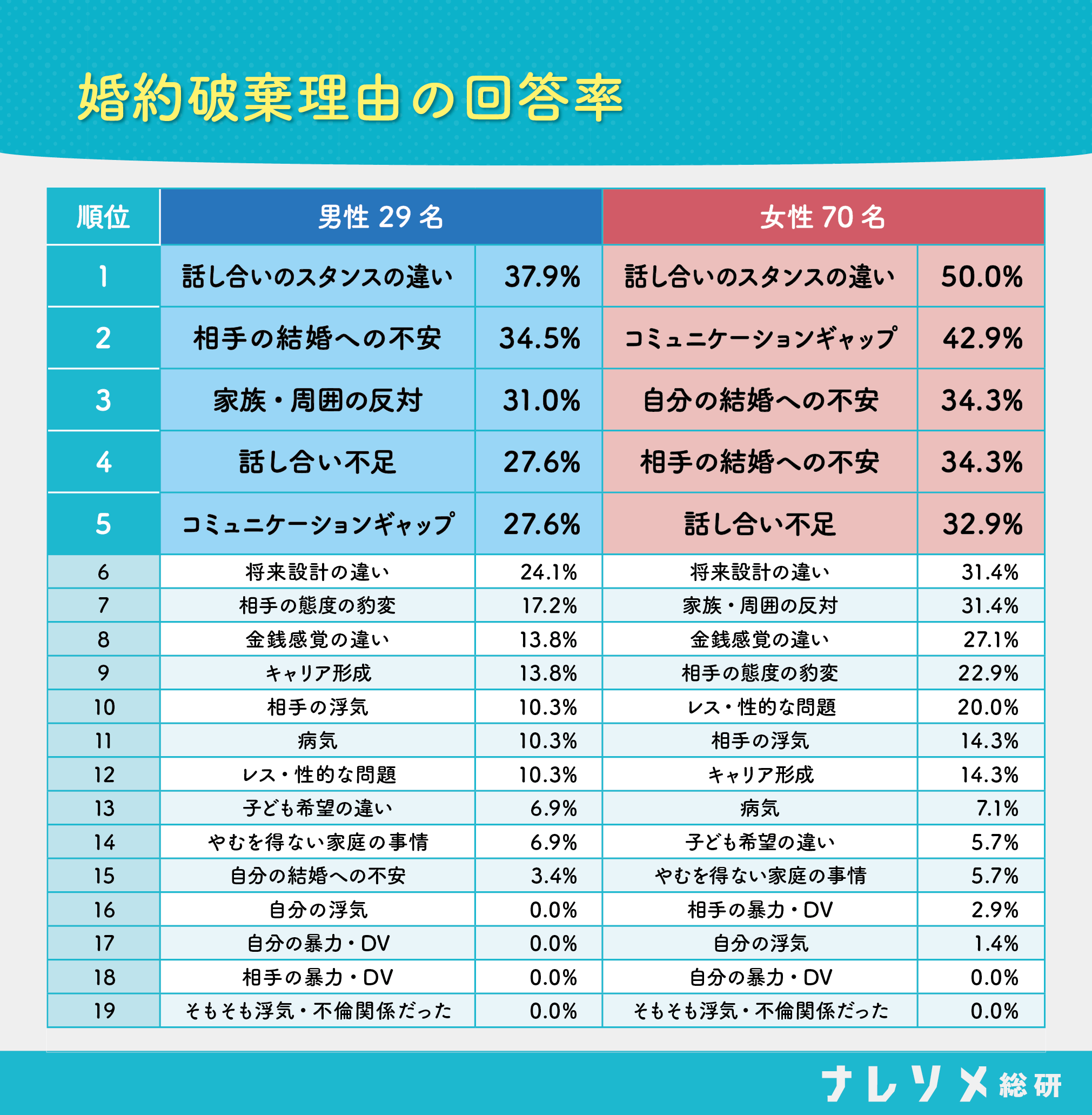 今回は、過去に婚約破棄の経験がある男女99名(男性29名、女性70名)に「婚約破棄の理由」を回答してもらい、男女の違いを調査しました。