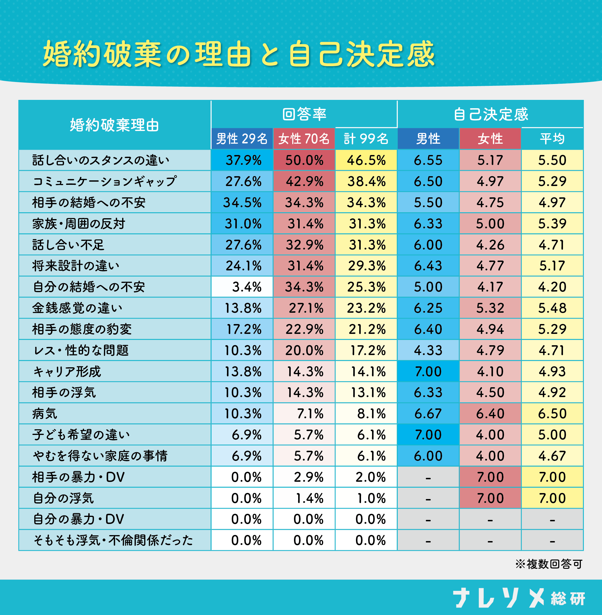 この結果、「自分の結婚への不安」を婚約破棄の原因とする女性が、男性の10倍も多くなったと考えられます。