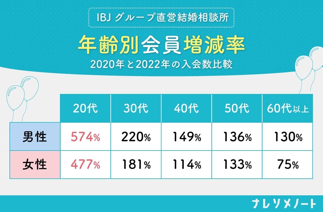 結婚相談所というと「ハードルが高そう」「最後の手段では……?」と思う方もいるかもしれません。しかし、IBJによると、2020年から2022年にかけて、男女ともに20代の会員の伸び率が、他の年代の伸び率を大きく引き離しています。