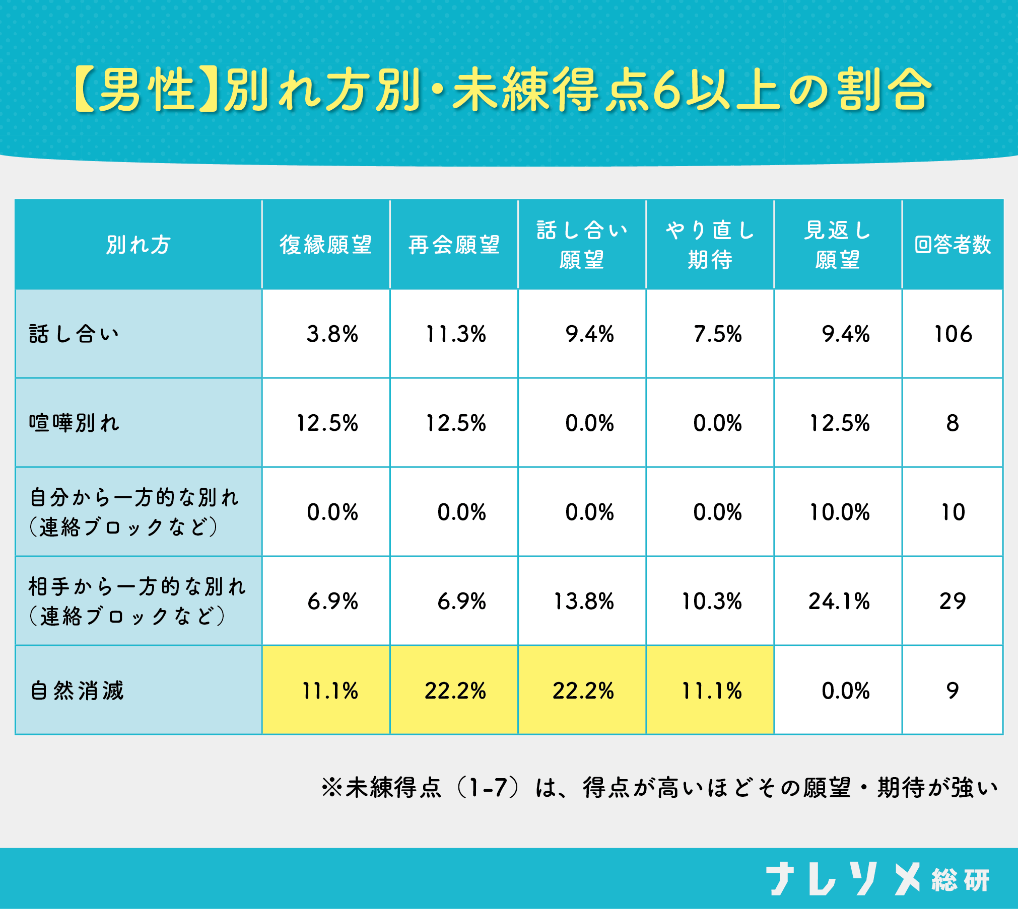 またナレソメ総研のデータによると、交際して別れた場合、しっかりと話し合って別れたカップルよりも「自然消滅」で別れたカップルのほうが、未練が残りやすいことがわかっています。