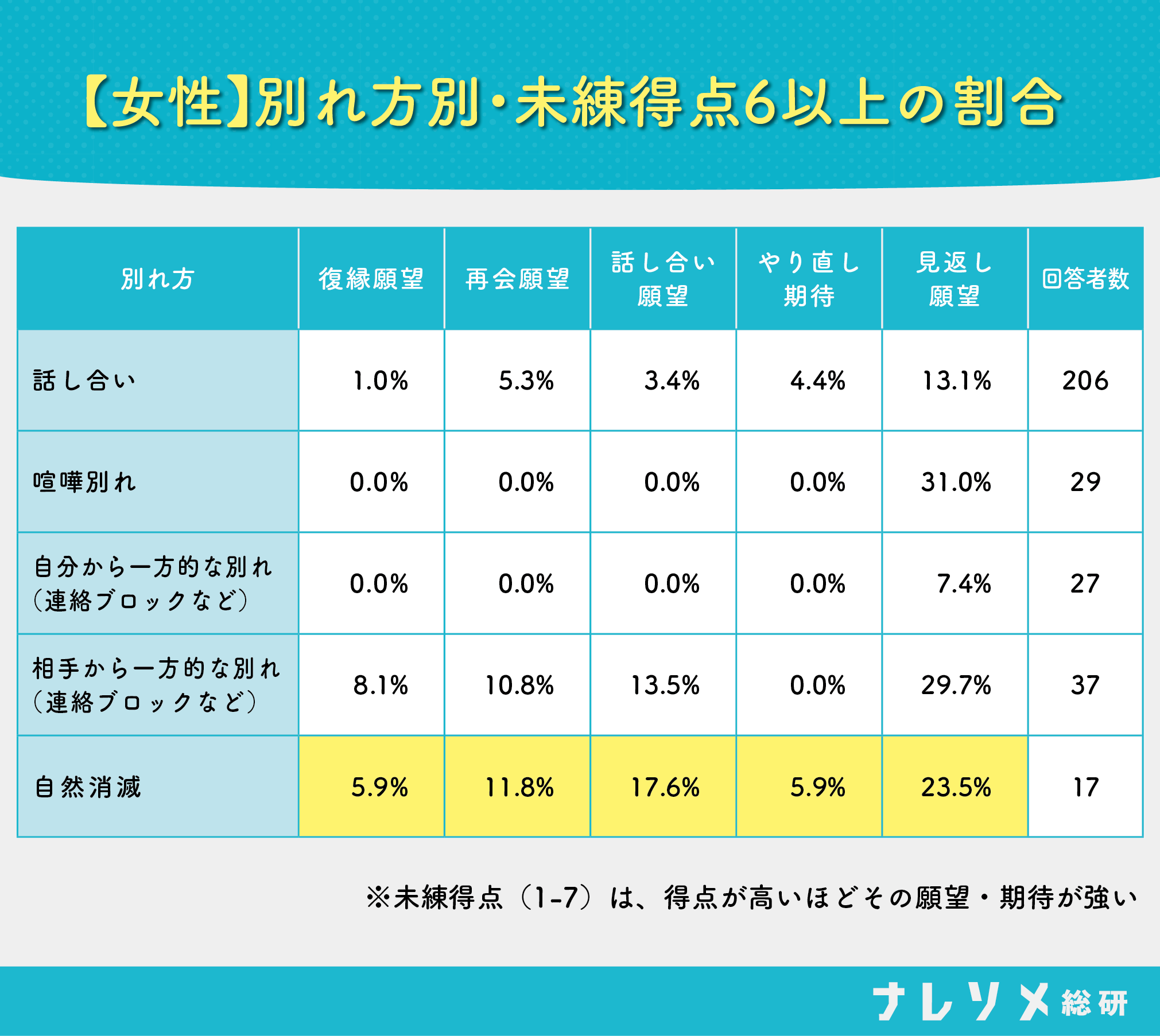 自然消滅の場合、男女ともに「また会いたい」という再会願望、「ちゃんと話し合いたい」という話し合い願望が強く出ます。