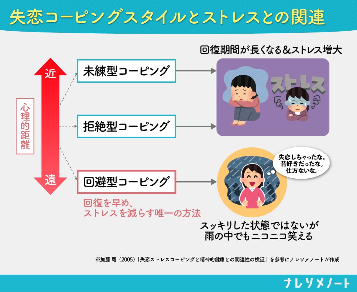 一方で、回避型コーピングは回復を早め、ストレスを減少させます。それにより、完全にスッキリした状態でなくても「失恋しちゃったな」「昔好きだったな、仕方ないな」と思えるようになるのです。