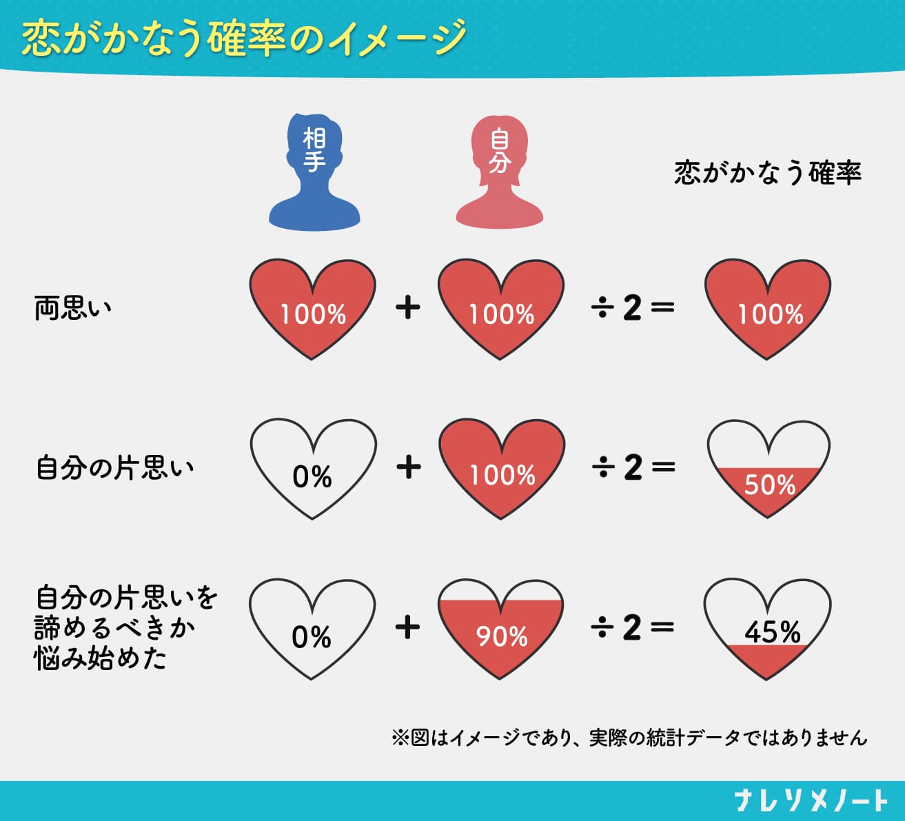 恋愛はお互いに好きな気持ちがあるから成就するものです。数字で考えてみましょう。例えば、恋がかなう確率として、相手が振り向いてくれない時点で相手の気持ちが0%、自分が好きという気持ちが100%だとしたら、それぞれの気持ちを足して2人で割ると(0 + 100)÷2=50%。しかし、自分が「諦めるべきか?」と悩み始めた時点で、自分の気持ちは100%から徐々に減り、50%を切ります。その恋がかなう確率が50%を下回った時点で諦めたほうが賢明といえます。