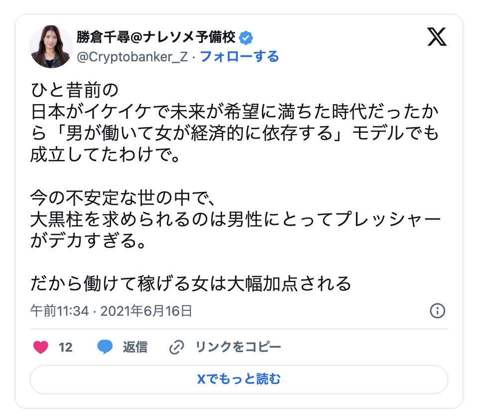 しかし、結婚という観点では残念ながらいまだに「男性が女性を養うべきだ・養えるだけの経済力があるべきだ」という価値観が深く根付いています。