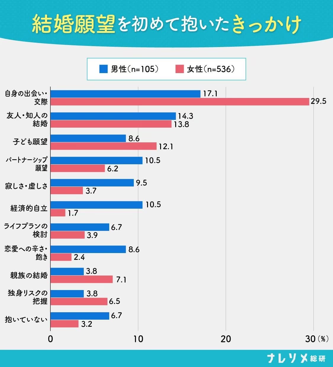 「結婚願望を抱くきっかけ」についてナレソメ総研が調査したところ、男女で大きな差が出ました。その結果がこちらです。