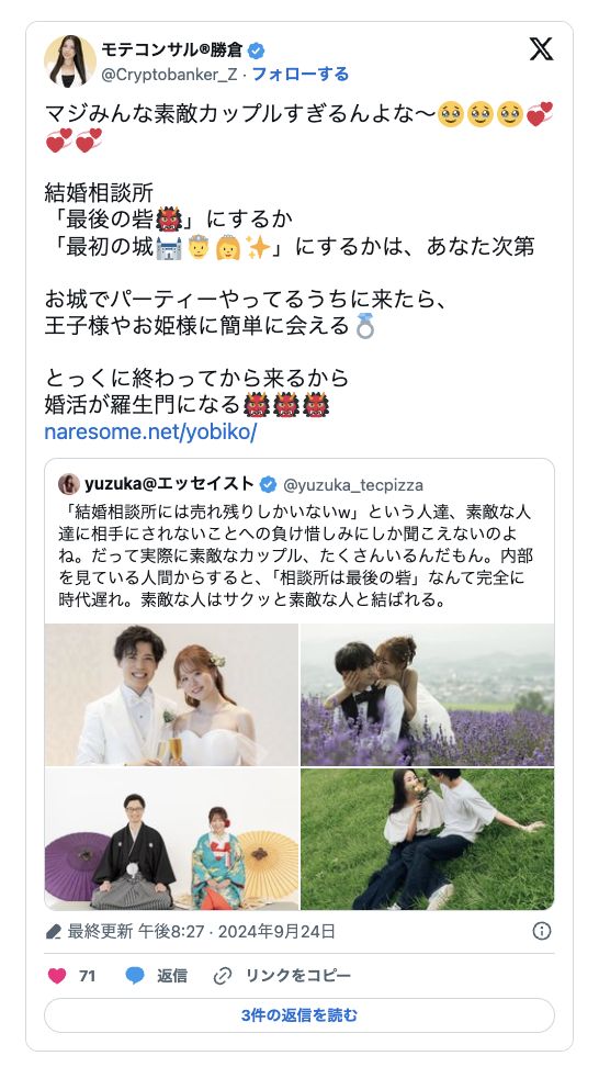 アプリの「結婚する気のない」イケメンはずっとアプリに居続けますが、結婚相談所の「結婚希望の」イケメンはあっという間に成婚退会していきます。そのため、少なく見えるのです。