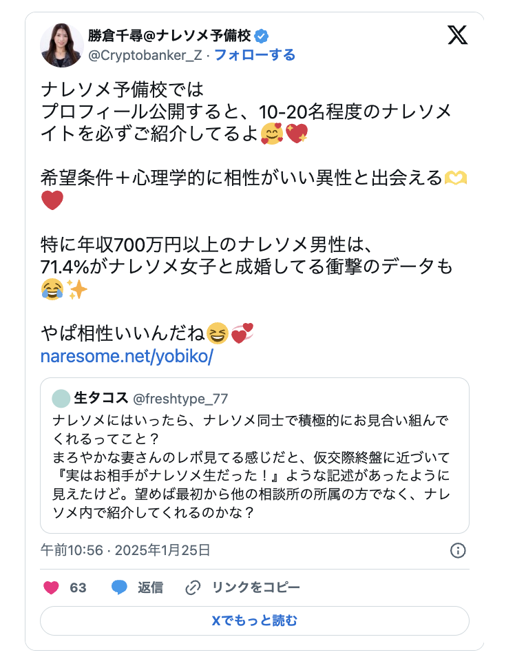 自社会員同士のマッチング環境が非常に整っている点も、ナレソメ予備校ならではのメリットだ。