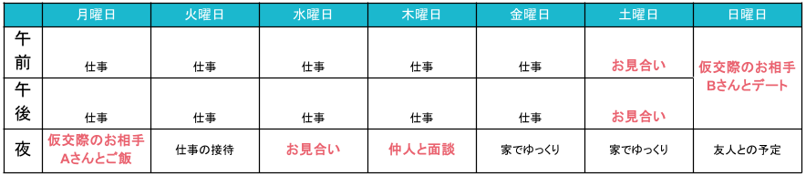 お見合いや仮交際の人数によって個人差はあるが、1週間の予定のうち、婚活が一定の割合を占めることになる。また、お相手と真剣に向き合うには、意外と体力や精神力も使う。
