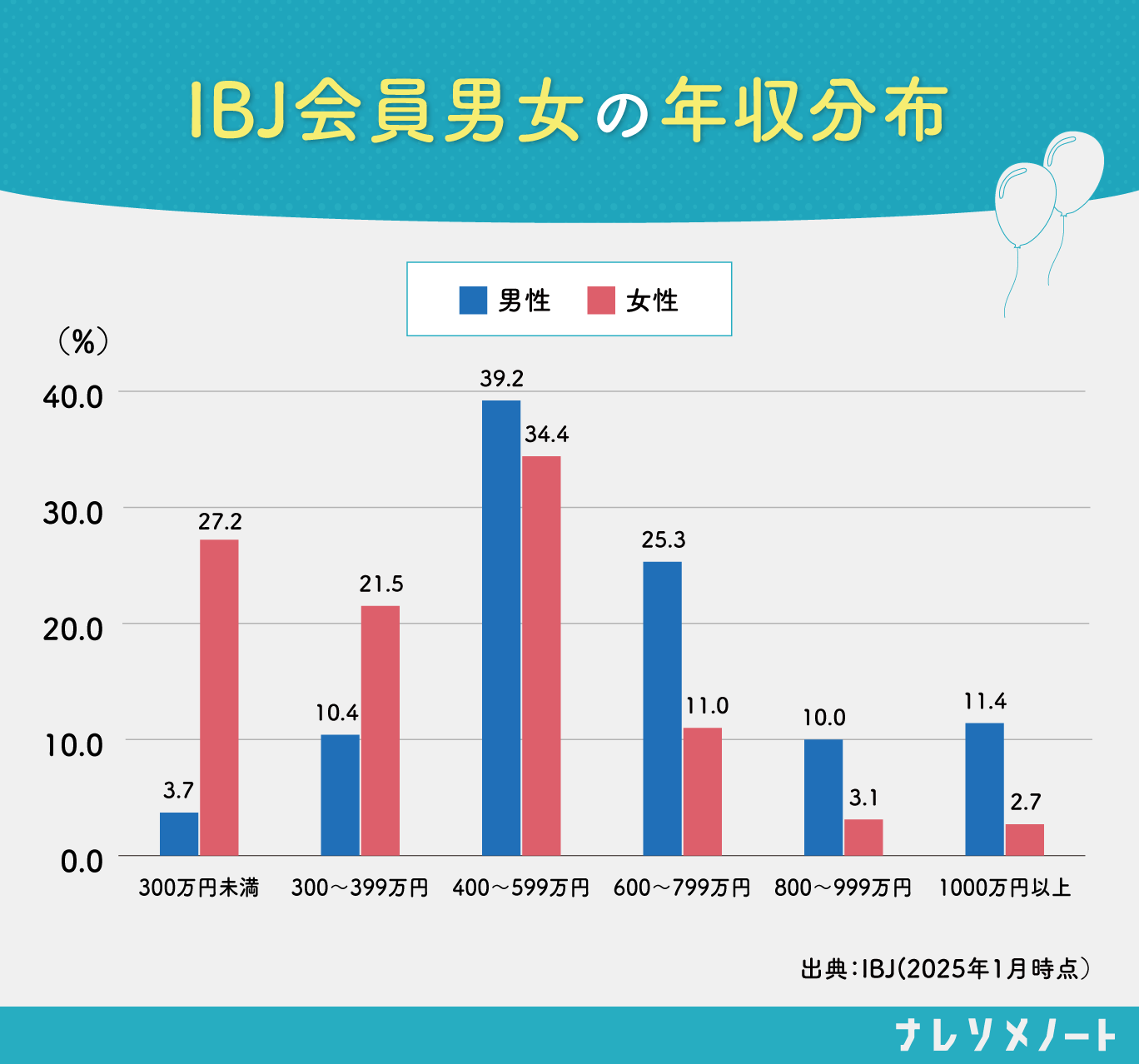国税庁の民間給与実態統計調査によると、平均年収は男性が587万円、女性が333万円のため、IBJを利用している女性は世間よりも年収が高い傾向がある。