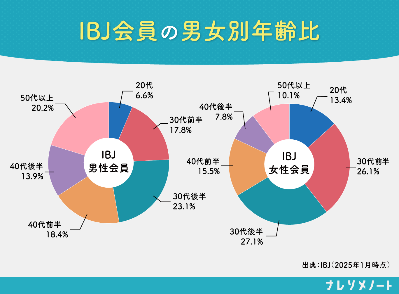 IBJの利用者データを見ていくと、年齢層は、20代の利用者は男性が6.6%、女性が13.4%となっており、極端に若い異性と出会いたい人は、相手が限られてくる可能性がある。