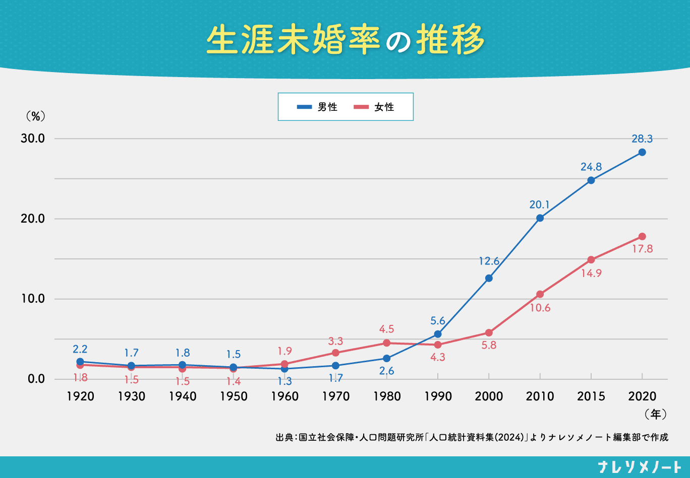 実は男性の生涯未婚率を見ると、この20年でなんと5倍に(※)! 女性以上に増加していて、2020年時点で実に3割近くの人が生涯未婚というデータが出ているんです。