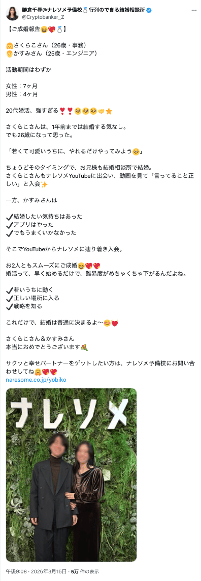 そして成婚率84.1%(※ナレソメ予備校の2025年7〜12月における全退会者のうち成婚退会者の割合)という驚異的な数字が、ナレソメの圧倒的な実力を裏付けています。