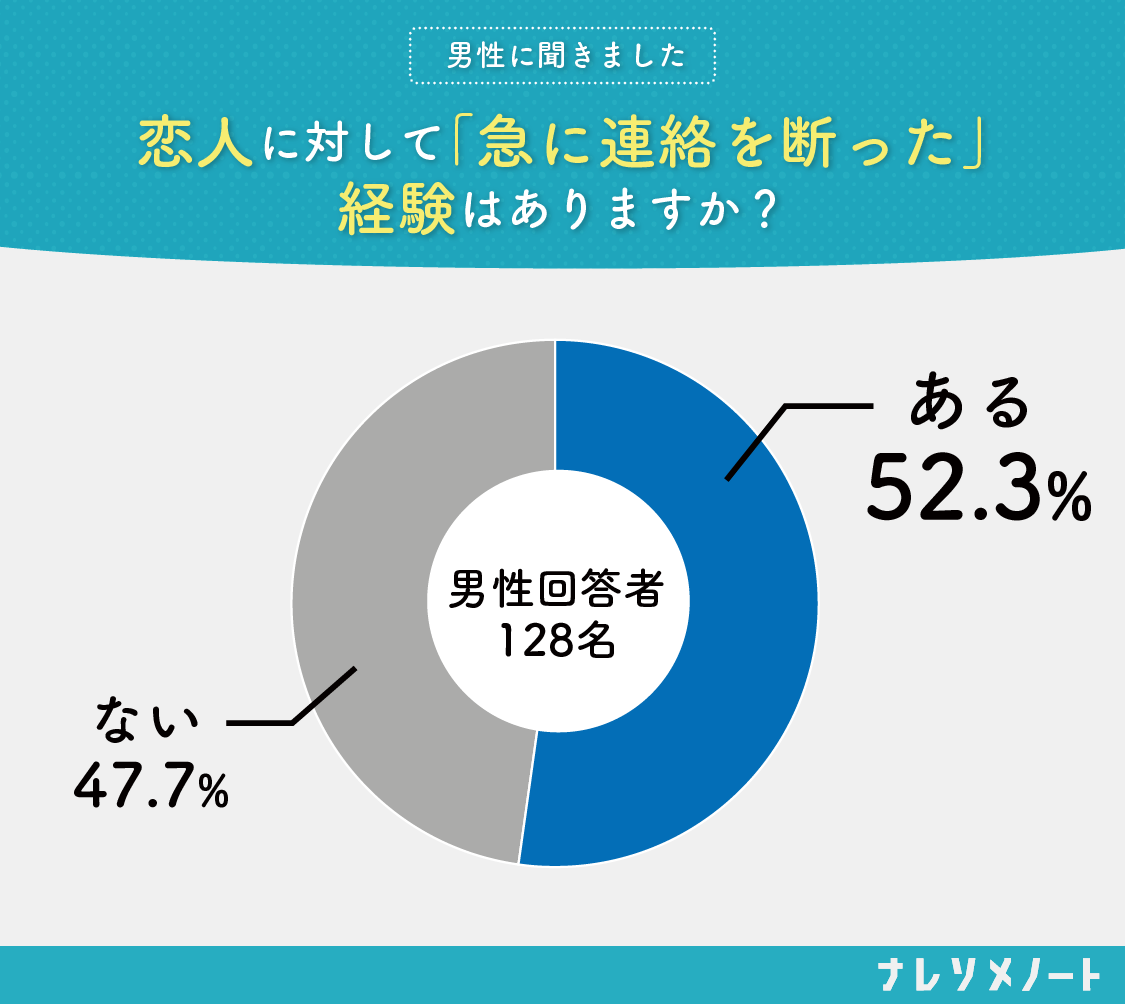 株式会社ネクストレベルの調査では、「恋人に対して急に連絡を断った経験があるかどうか」との質問に対し、18歳〜49歳の独身男性128人のうち52.3%が「経験あり」と回答しています(※)