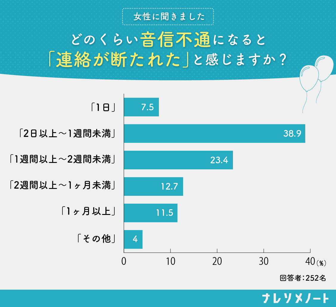株式会社ネクストレベルが18歳〜49歳の独身女性252人に行った調査によると、38.9%が「2日以上〜1週間未満」、23.4%が「1週間以上~2週間未満」音信不通になると「連絡が断たれたと感じる」と回答しています(※)