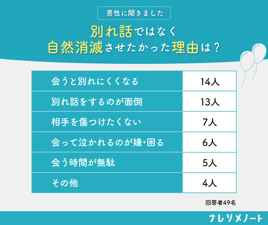 ネクストレベルの調査では、「連絡を断って自然消滅させたかった」という男性49人に理由を尋ねたところ、13人が「別れ話をするのが面倒」だから、6人が「会って泣かれるのが嫌・困る」からと回答しています(※)