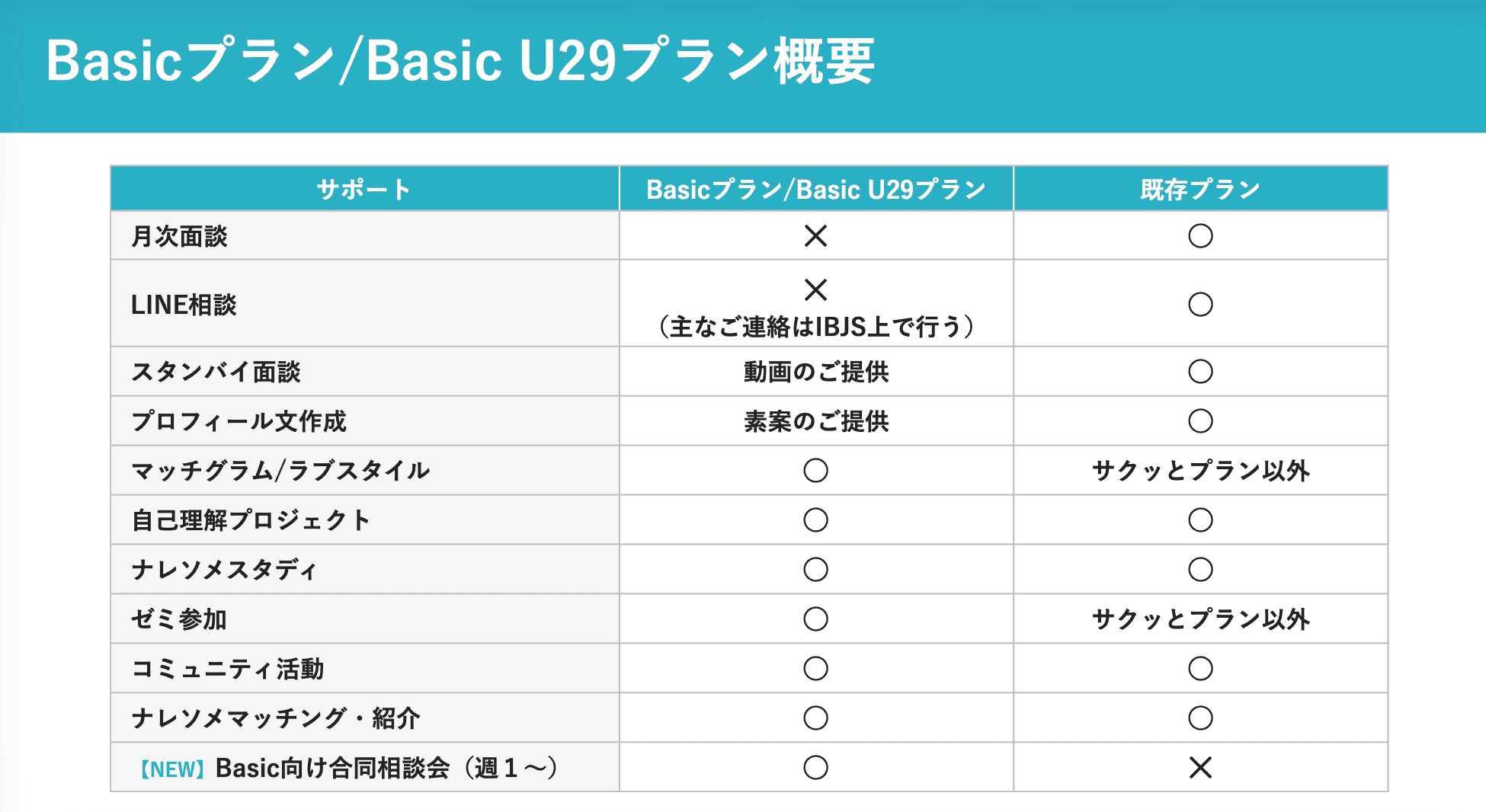 ご覧いただくと明らかですが、既存プランとほぼ変わりません。ただし、プランナーがいないので、月次の面談やLINE相談はありません。