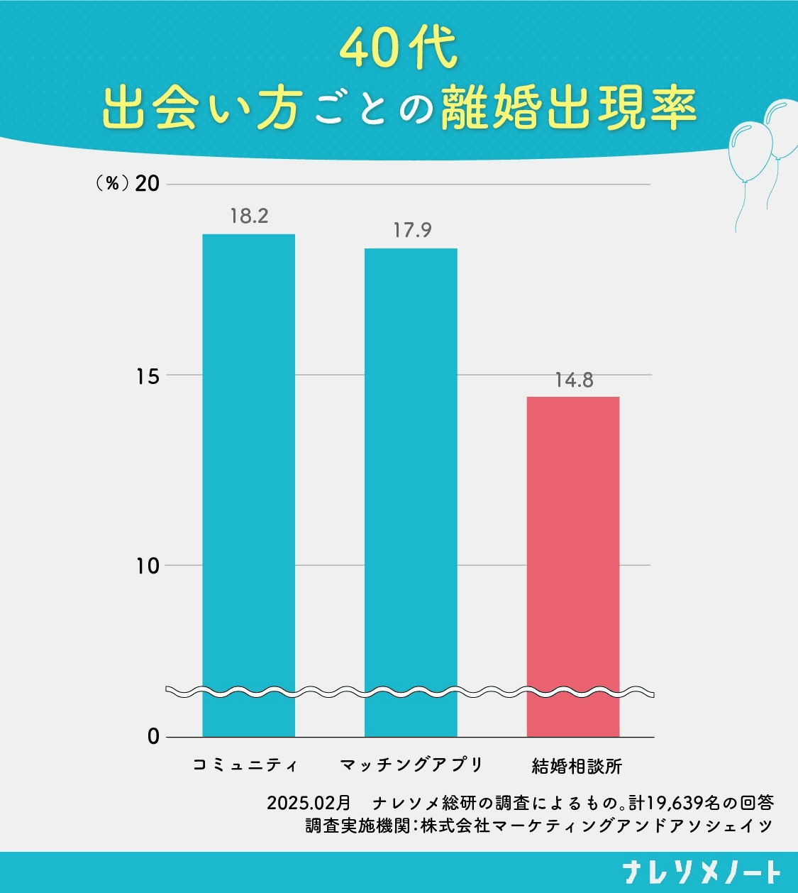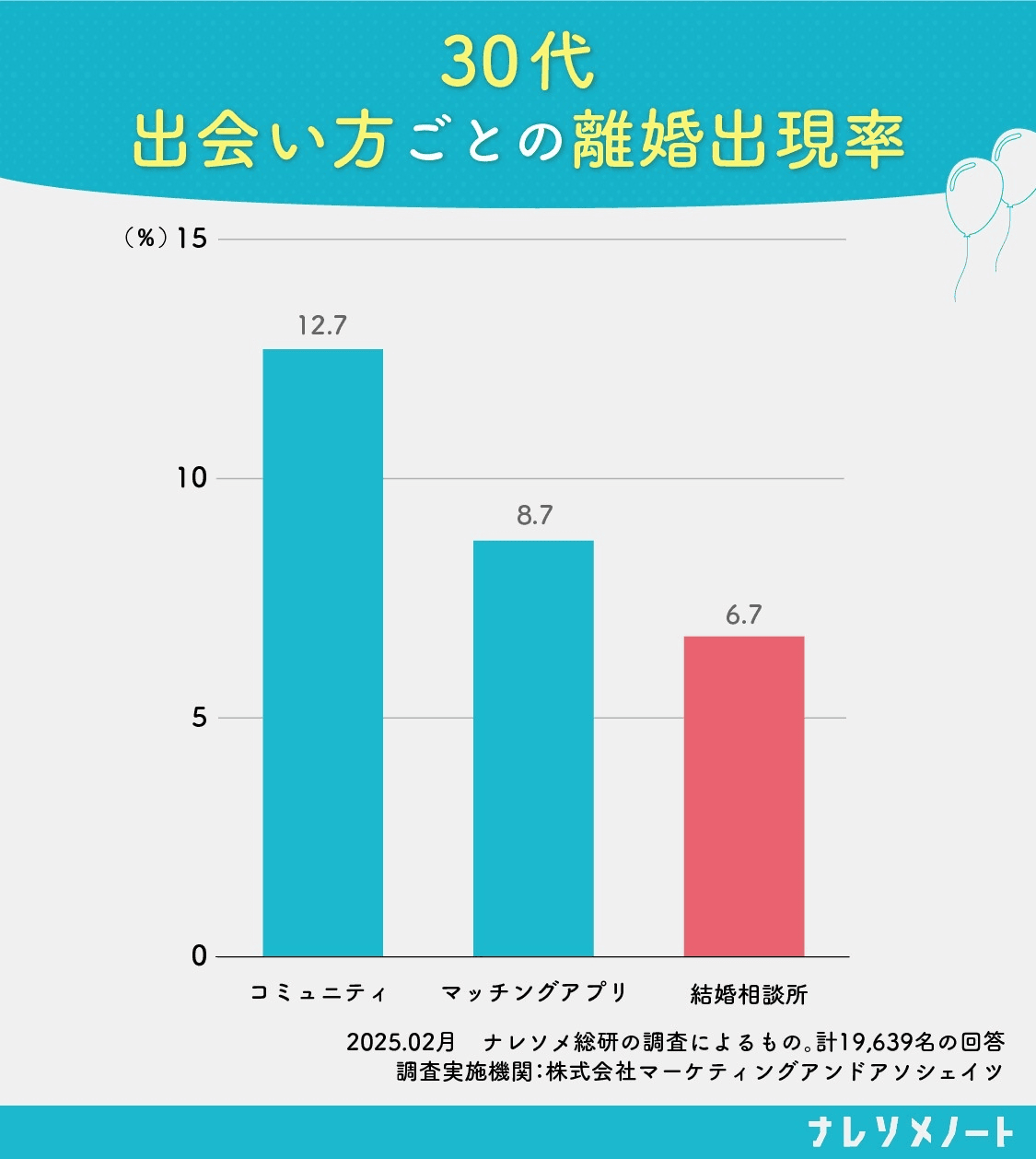 実際にナレソメ総研の調査でも、結婚相談所で出会った夫婦はマッチングアプリやコミュニティに比べて離婚率が低いことが確認されています。