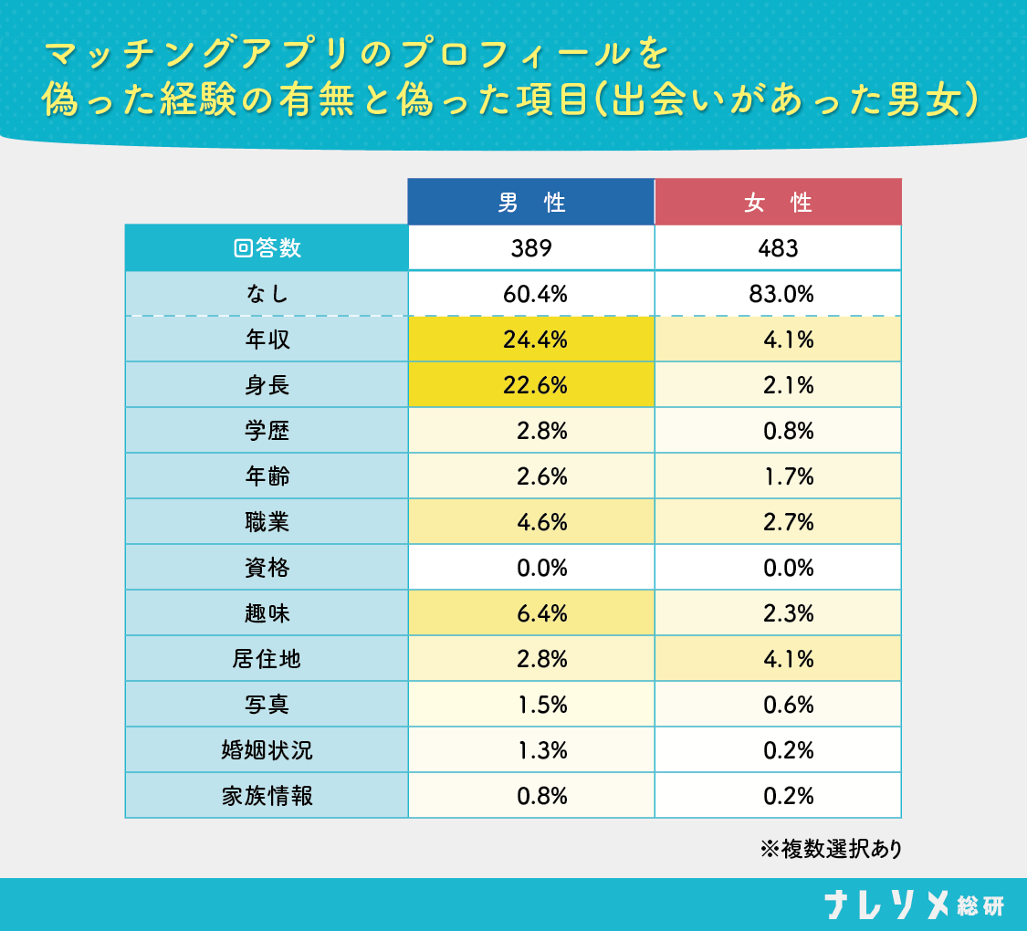 「アプリで一度でも出会った経験がある人」に限定すると、うそをついた経験がある男性の割合は39.6%にまで跳ね上がります。つまり、女性がマッチングアプリで実際に出会う男性に限れば、約4割、実に5人に2人がなんらかのうそをついているのです。