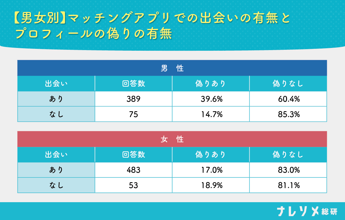 こちらのデータは、うそをついた経験の有無と、実際に出会えたかどうかの関係性を示したものです。
