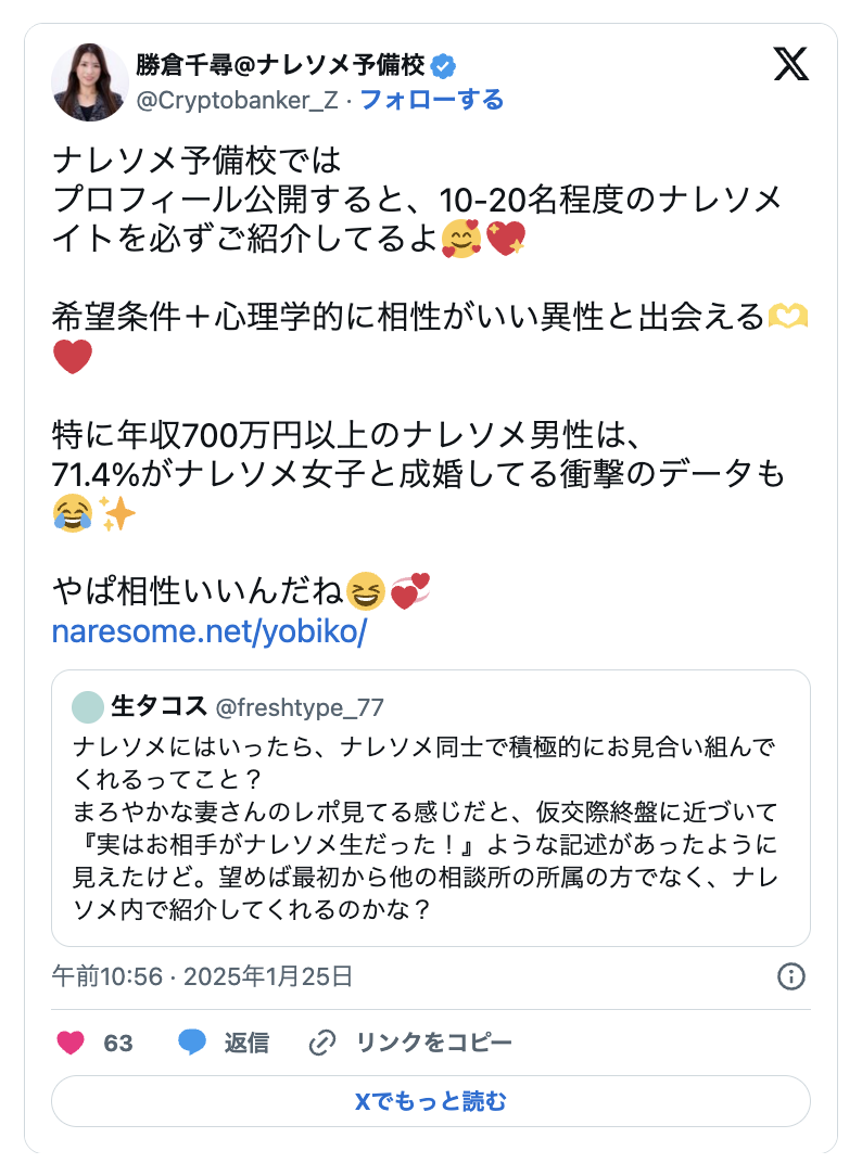 自社会員同士のマッチング環境が非常に整っている点も、ナレソメ予備校ならではの強みです。