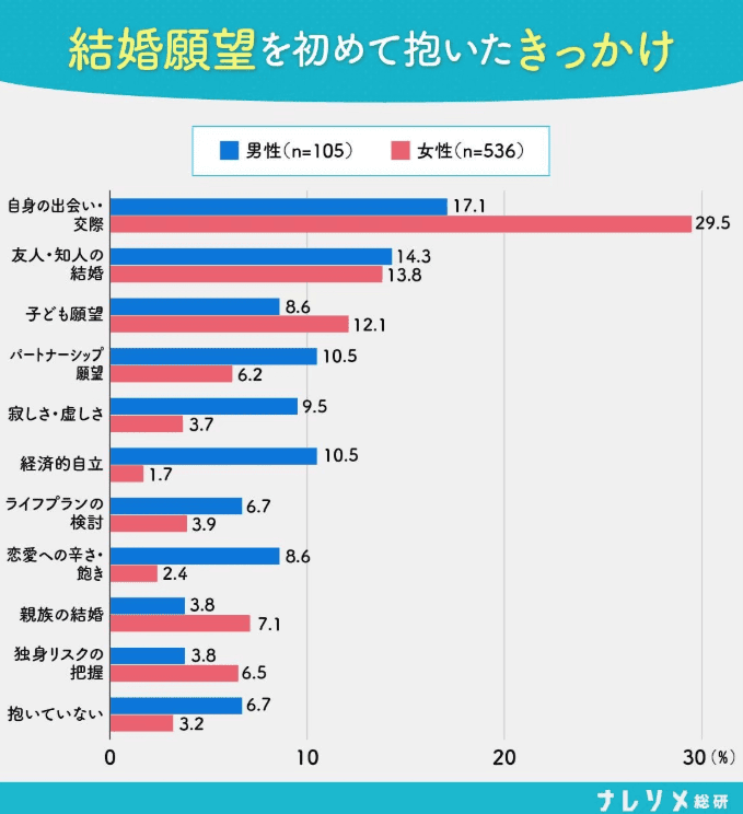 ナレソメ予備校が実施した「結婚願望を抱いたきっかけ」に関する調査では、男性は「経済的に自立した」「1人が寂しいと感じた」など、自分の状況や環境の変化をきっかけに結婚を意識するという結果が出ています。