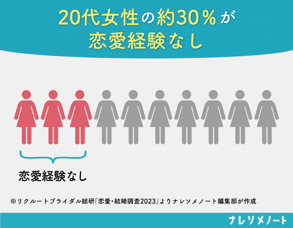 さらに、リクルートブライダル総研が発表した2023年の調査では、20代女性の約3人に1人(約30%)が「異性との交際経験がない」と回答。20代で全く恋愛経験がないという女性も決して珍しくなく、恋愛離れが進んでいることを示しています。