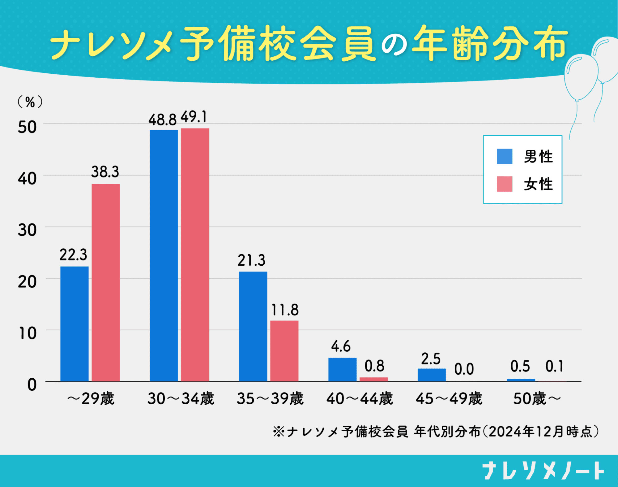 また、ナレソメ予備校は他の結婚相談所と比べて20代〜30代前半の若い会員が多いのも特徴です。