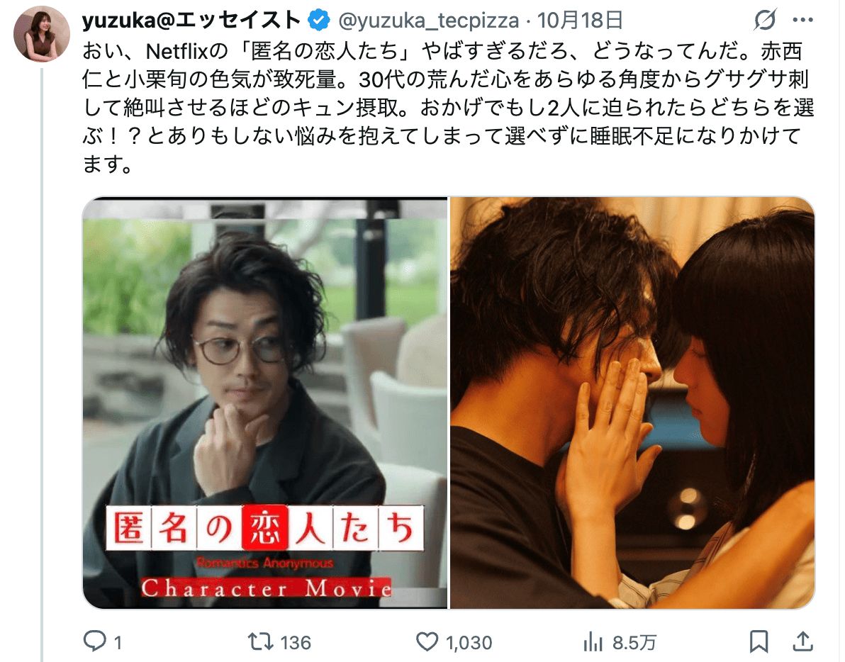 X(旧Twitter)で話題沸騰中のドラマ『匿名の恋人たち』(Netflix)。