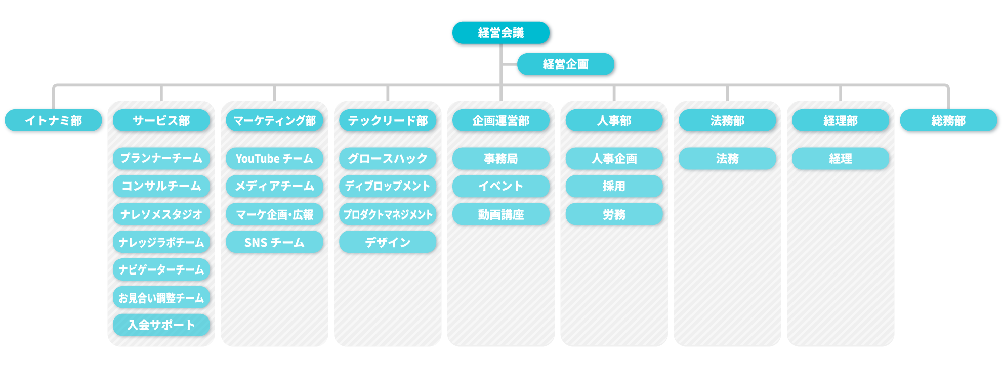 ナレソメは現在サービス、マーケティング、企画運営、テックリード、イトナミ、経営企画、コーポレートの